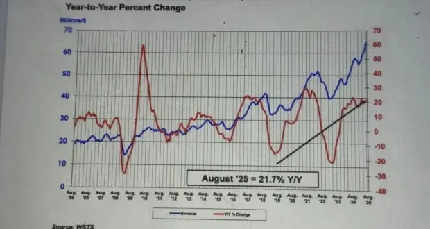 August semiconductor sales of $64.9 billion were up 21.7% on the $53.3 billion of August 2024 and up 4.4% on the $62.1 billion of July 2025.