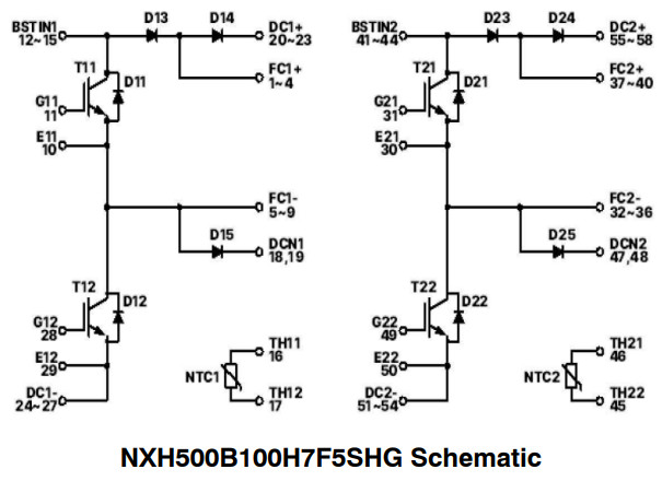 Called NXH500B100H7F5SHG, it can handle continuous collector currents up to 210A (630A pulsed) (Tj = 175°C). Abs max power dissipation is 305W.
