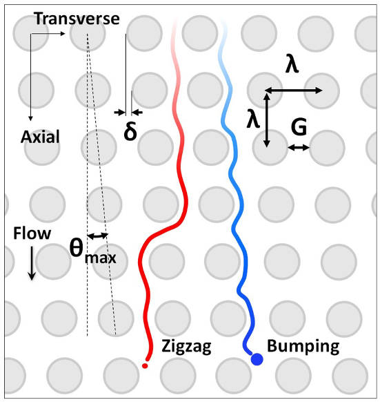 Larger and smaller particles either bounce off pillars or get swept around in slipstreams of individual pillars. On average, these tend to follow the flow direction instead of the array direction.