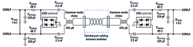 The wired interface is designed to support capacitive or inductive isolation for robustness amid stringent automotive EMC/EMI specification limits. Figure 5 shows an example using capacitors and chokes. The circuit would be designed between each battery monitor PCB, with as many as 64 devices in one stack to support varying sizes of vehicle battery modules.