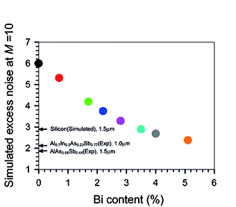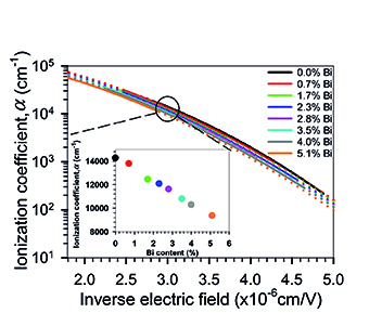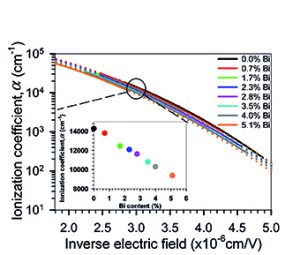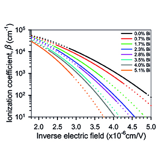 The research team reported the growth and analysis of a series of GaAsBi devices with up to ~5 % Bi, which leads to a significant change of the material’s ionisation properties and extends the material’s absorption cut-off to longer wavelengths than can be achieved by silicon. From detailed opto-electronic characterisation, the α and β coefficients of GaAsBi were calculated at a range of different electric fields and for different Bi contents. As the Bi content is increased, α remains effectively constant, whereas β is reduced by orders of magnitude at low electric fields resulting in a lowering of the excess noise.