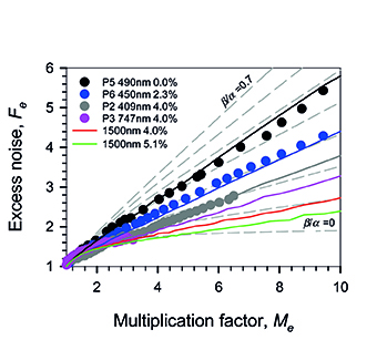 The abilities of electrons and holes to cause impact ionisation are quantified by the electron and hole ionisation coefficients α and β. Silicon is a near-ideal APD material, as electrons can readily cause impact ionisation, whereas holes cannot, meaning the α/β ratio is very large and the excess noise due to the stochastic ionisation process is reduced. Silicon’s indirect band gap, however, means that thick layers are required to absorb photons, and silicon’s detection is limited to around 1µm.