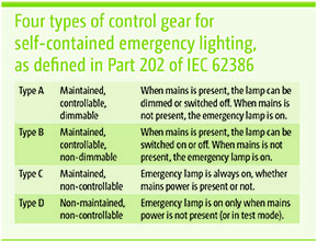 As defined in Part 202 of IEC 62386, control gear for self-contained emergency lighting must correspond to one of four types (A, B, C or D). Fundamentally, they all share one common factor: when the mains power goes off, the emergency lighting must be on.