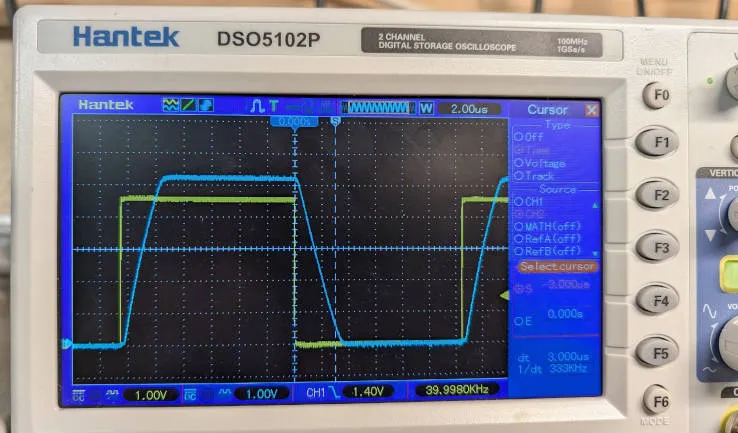 66.6kΩ gave Trise = 2.6μs, Tfall = 3.1μs (right, at 40kHz)