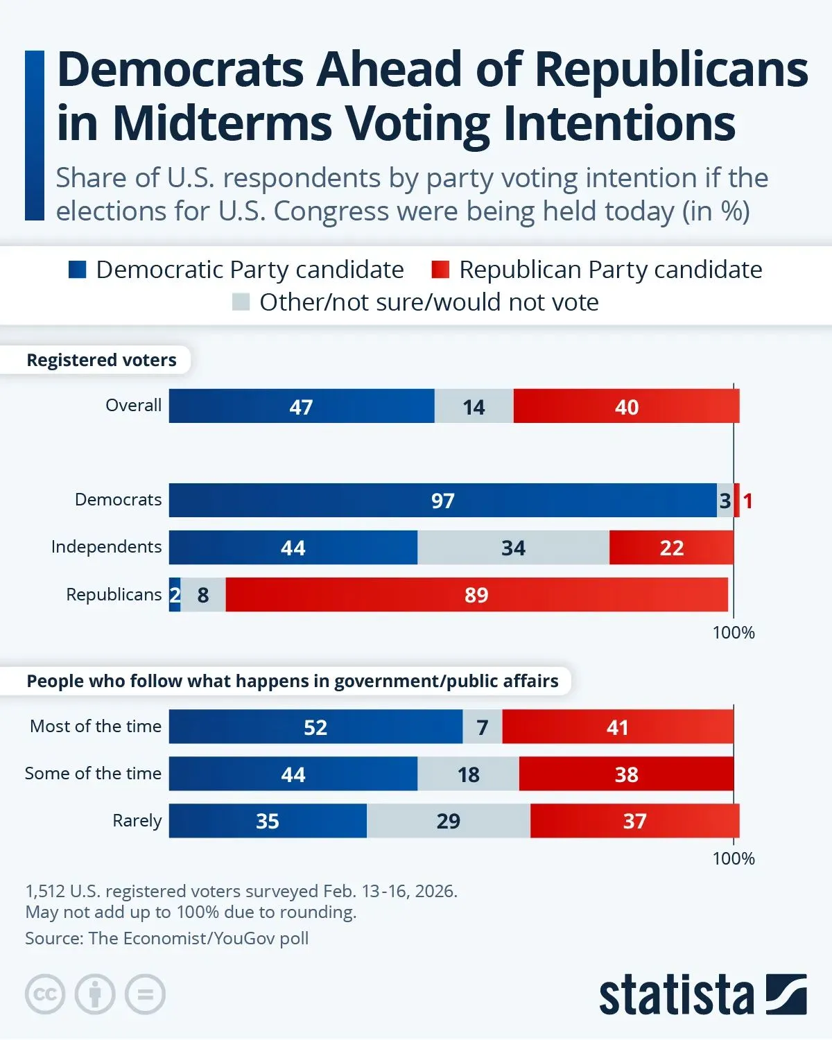 YouGov points out that significant shares of Republican-leaning registered voters say they wouldn’t vote or aren’t sure how they would vote, especially among those who don’t closely follow the news, while the vast majority of Democratic-leaning registered voters say they would vote for Democratic candidates.